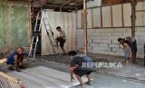 Warga Kampung Susun Bayam (KSB) membangun mushola di hunian sementara di Jalan Tongkol 10, Pademangan, Jakarta Utara, Selasa (28/5/2024). Sebanyak 54 kepala keluarga di relokasi ke hunian sementara setelah dilakukan pengusiran paksa di rusun Kampung Susun Bayam sebelumnya. Salah satu warga Neneng (45) mengeluhkan tentang kondisi hunian sementara yang sudah tidak layak. Sementara, Yuli (24) berharap Ia dan keluarganya bisa kembali menempati  rusun KSB. (FOTO : Republika/Thoudy Badai)