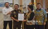 Deputi Kepala BPKP Bidang Investigasi Agustina Arumsari (dua kanan) memberikan hasil perhitungan kepada Jampidsus Febrie Adriansyah (dua kiri) disaksikan Jaksa Agung ST Burhanuddin (kiri) dan Kepala BPKP Muhammad Yusuf Ateh (kanan) usai memberikan keterangan pers terkait Penyampaian Hasil Perhitungan Kerugian Negara (PKN) dalam Penyidikan Perkara Timah di Kejaksaan Agung, Jakarta, Rabu (29/5/2024). Kejaksaan Agung (Kejagung) Republik Indonesia mengungkapkan, nilai kerugian keuangan negara dalam perkara dugaan tindak pidana korupsi dalam tata niaga komoditas timah di wilayah Izin Usaha Pertambangan (IUP) PT Timah Tbk tahun 2015-2022, mencapai Rp 300 triliun. Angka fantastis ini berdasarkan hasil perhitungan Jampidsus Kejagung, Badan Pengawasan Keuangan dan Pembangunan (BPKP), serta sejumlah ahli. (FOTO : Republika/Prayogi)