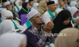Seorang calon haji memanjatkan doa saat upacara pelepasan jamaah calon haji Aceh kloter pertama di Banda Aceh, Aceh, Rabu (29/5/2024). Sebanyak 393 jamaah calon haji kloter pertama dari total 12 kloter Embarkasi Aceh resmi diberangkatkan ke tanah suci dalam penyelenggaraan haji tahun 1445 H/2024.  (FOTO : ANTARA FOTO/Khalis Surry)