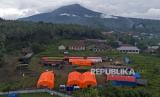 Foto udara suasana posko pengungsian di Desa Gam Ici, Kabupaten Halmahera Barat, Maluku Utara, Jumat (31/5/2024). Pemerintah Kabupaten Halmahera Barat menetapkan masa tanggap darurat bencana erupsi Gunung Ibu diperpanjang 14 hari ke depan dengan memfokuskan penanganan pengungsi yang terdampak karena aktivitas Gunung Ibu masih berstatus level IV (Awas) sehingga masyarakat diimbau agar tidak beraktivitas di radius 4 kilometer dan perluasan sektoral berjarak 7 kilometer dari arah utara bukaan kawah. (FOTO : ANTARA FOTO/Andri Saputra)