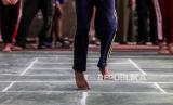 Pelajar mengikuti perlombaan engklek saat lomba kaulinan baheula di Kantor DPRD Kota Bogor, Jawa Barat, Ahad (2/6/2024). Perlombaan permainan tradisional berupa balap bakiak, egrang, congklak dan engklek tersebut sebagai upaya untuk melestarikan permainan tradisional kepada pelajar. (FOTO : Republika/Putra M. Akbar)