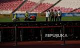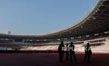 Petugas berjaga di area Stadion Utama Gelora Bung Karno (SUGBK), Jakarta, Rabu (5/6/2024). Erick Thohir mengungkapkan kondisi rumput di SUGBK sudah siap jelang laga kualifikasi Piala Dunia 2026 Zona Asia besok 6 Juni 2024 melawan Irak. Pada kesempatannya, Erick Thohir menjelaskan pentingnya kolaborasi antara PSSI dengan PPKGBK sebagai pengelola dari pihak pemerintah untuk memperhatikan jadwal penggunaan stadion sekaligus perawatannya untuk kemajuan Timnas Indonesia. (FOTO : Republika/Thoudy Badai)