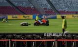 Petugas melakukan perawatan rumput Stadion Utama Gelora Bung Karno (SUGBK), Jakarta, Rabu (5/6/2024). Erick Thohir mengungkapkan kondisi rumput di SUGBK sudah siap jelang laga kualifikasi Piala Dunia 2026 Zona Asia besok 6 Juni 2024 melawan Irak. Pada kesempatannya, Erick Thohir menjelaskan pentingnya kolaborasi antara PSSI dengan PPKGBK sebagai pengelola dari pihak pemerintah untuk memperhatikan jadwal penggunaan stadion sekaligus perawatannya untuk kemajuan Timnas Indonesia. (FOTO : Republika/Thoudy Badai)
