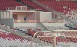 Petugas melakukan perawatan area tribun Stadion Utama Gelora Bung Karno (SUGBK), Jakarta, Rabu (5/6/2024). Erick Thohir mengungkapkan kondisi rumput di SUGBK sudah siap jelang laga kualifikasi Piala Dunia 2026 Zona Asia besok 6 Juni 2024 melawan Irak. Pada kesempatannya, Erick Thohir menjelaskan pentingnya kolaborasi antara PSSI dengan PPKGBK sebagai pengelola dari pihak pemerintah untuk memperhatikan jadwal penggunaan stadion sekaligus perawatannya untuk kemajuan Timnas Indonesia. (FOTO : Republika/Thoudy Badai)