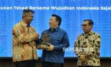 Kepala Kanwil DJP Jakarta Selatan I Dionysius Lucas Hendrawan (kiri) menyerahkan penghargaan kepada Presiden Direktur PT Adaro Energy Indonesia Tbk Garibaldi Thohir (tengah) disaksikan Staf Khusus Menteri Keuangan Bidang Komunikasi Strategis Yustinus Prastowo (kanan) di Jakarta, Kamis (6/6/2024). Dua anak perusahaan Adaro Group yaitu PT Laskar Semesta Alam (PT LSA) dan PT Alam Tri Bangun Indonesia (PT ATBI) mendapatkan apresiasi dan anugerah sebagai Wajib Pajak dengan Kontribusi Terbesar pada Tahun 2023 dari DJP Jakarta Selatan I. Sebagai perusaahan nasional, Adaro berkomitmen untuk terus berkontribusi bagi pembangunan dan kemajuan ekonomi Indonesia melalui pajak dan royalti. Pada Tahun 2023 Adaro Group telah memberikan kontribusi kepada megara senilai total US$ 2,995 miliar dalam bentuk pajak dan royalti. (FOTO : Republika/Thoudy Badai)