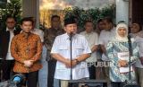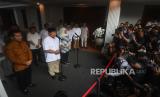 REPUBLIKA.CO.ID, JAKARTA -- Ketua Umum Partai Gerindra Prabowo Subianto bersama mantan Gubernur Jawa Timur Khofifah Indar Parawansa dan mantan Wakil Gubernur Jatim Emil Dardak menyampaikan keterangan kepada wartawan usai melakukan pertemuan di kediaman Prabowo di Jalan Kertanegara, Kebayoran Baru, Jakarta, Jumat (7/6/2024).