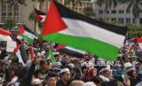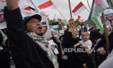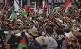 Sejumlah orang mengikuti aksi damai bermilyar dukungan untuk Gaza dan Palestina di Kawasan Patung Kuda, Monas, Jakarta, Ahad (9/6/2024) . Aksi tersebut menuntut agar Israel menghentikan tindakan agresi militer ke Palestina dan mengutuk keras tindakan brutal Israel yang menyerang warga sipil termasuk anak-anak. Dalam aksi itu juga menyerukan boikot terhadap produk-produk yang mendukung Israel. (FOTO : Republika/Prayogi)