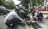 REPUBLIKA.CO.ID, JAKARTA -- Petugas Suku Dinas Perhubungan Jakarta Barat mencabut pentil sepeda motor yang diparkir di bahu jalan di kawasan Kembangan, Jakarta, Kamis (13/6/2024).