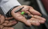 Petugas Suku Dinas Perhubungan Jakarta Barat menunjukkan pentil sepeda motor pelanggar aturan parkir yang telah dicabut di kawasan Kembangan, Jakarta, Kamis (13/6/2024). Operasi Cabut Pentil (OCP) itu digelar untuk memberikan sanksi kepada pengendara yang parkir sembarangan atau tidak pada tempatnya. (FOTO : ANTARA FOTO/Hafidz Mubarak A)