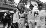 Sejumlah orang berpakaian jaman dulu era tahun 1930 hadir di Jalan Braga, Kota Bandung, saat acara 142 Jaar Oude Braga Straat bersama anggota Paguyuban Sapedah Baheula Bandung, Ahad (16/6). Kegiatan tersebut digelar dalam rangka 142 Tahun Jalan Braga, dan para anggota komunitas sepeda tua tersebut mencoba menghadirkan suasana Jalan Braga tempo dulu. (FOTO : Edi Yusuf)