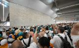 Jamaah haji berjalan untuk melaksanakan lempar jumrah aqobah di Jamarat, Makkah, Arab Saudi, Ahad (16/6/2024). Lempar jumrah aqobah merupakan salah satu syarat yang wajib dilakukan pada ibadah haji sebagai simbol pengusiran setan yang pernah dilakukan Nabi Ibrahim AS. (FOTO : EPA-EFE)
