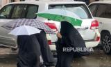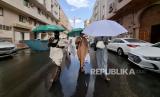 Warga Arab Saudi memakai payung saat Kota Mekkah diguyur hujan, Senin (17/6/2024). Kota Mekkah diguyur hujan deras. Peristiwa langka itu terjadi pada Senin (17/6/2024) pukul 16.00 Waktu Arab Saudi (WAS), bersamaan dengan jamaah haji melakukan mabit di Mina dan melontar jumroh. Warga Saudi menyambut hujan dengan turun ke jalan sembari berdoa. (FOTO : Republika/Karta Raharja Ucu)