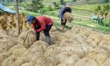 Petani menjemur padi beras merah saat masa panen raya di Desa Jatiluwih, Tabanan, Bali. Selasa (18/6/2024). Tradisi panen padi beras merah yang digelar setiap bulan Juni tersebut menjadi daya tarik pariwisata di kawasan objek wisata yang telah ditetapkan UNESCO sebagai warisan budaya dunia itu. (FOTO : ANTARA FOTO/Nyoman Hendra Wibowo)