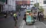 REPUBLIKA.CO.ID, JAKARTA -- Petugas Satpol PP memantau pedagang kaki lima (PKL) mendorong gerobak dagangannya saat penertiban di kawasan Kota Tua, Jakarta, Selasa (18/6/2024).