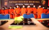 REPUBLIKA.CO.ID, ACEH -- Para tersangka pemain judi online yang diamankan Satuan Reskrim Polresta Banda Aceh di Banda Aceh, Aceh, Rabu (19/6/2024).