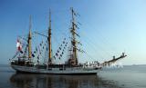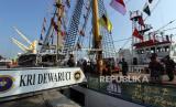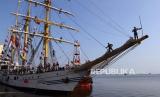 KRI Dewaruci berlayar menuju Sabang membawa Laskar Rempah Batch II MBJR 2024 dari Pelabuhan Dumai, Riau, Rabu (19/6/2024). Sebelumnya KRI Dewaruci membawa Laskar Rempah rombongan Batch I Muhibah Budaya Jalur Rempah (MBJR) 2024 yang telah menempuh pelayaran sejak (7/6) lalu dari Jakarta, Belitung Timur, Dumai dan Siak, berikutnya rombongan Batch II dari Dumai berlayar dengan rute Sabang, Malaka dan akan berakhir di Tanjung Uban pada (7/7) mendatang dengan misi memperkenalkan kepada generasi muda tentang sejarah peradaban rempah yang melahirkan keragaman budaya bangsa Indonesia. (FOTO : ANTARA FOTO/Aswaddy Hamid)