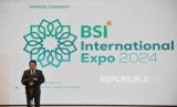 Direktur Utama BSI Hery Gunardi memberikan sambutan dalam acara pembukaan BSI International Expo 2024 di Jakarta Convention Center (JCC), Senayan, Jakarta, Kamis (20/6/2024). BSI International Expo 2024 merupakan acara berskala International sebagai wujud komitmen untuk terus mendorong perkembangan ekosistem keuangan syariah dan gaya hidup halal. Selama gelaran ini, BSI menargetkan jumlah transaksi sebesar Rp1 triliun dan 20.000 pengunjung. Mengusung tema Connecting You to Halal Lifestyle Ecosystem, acara tersebut digelar pada 20-23 Juni 2024. (FOTO : Republika/Prayogi)