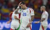 Ekspresi pemain Italia Mattia Zaccagni seusai dikalahkan Spanyol pada pertandingan Grup B Euro 2024 di Gelsenkirchen, Jerman, Kamis (20/6/2024). Spanyol menang dengan skor tipis 1-0 lewat gol bunuh diri pemain Italia Riccardo Calafiori. Berkat kemenangan ini, Spanyol lolos ke babak 16 besar Euro 2024. (FOTO : AP Photo/Alessandra Tarantino)