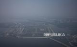 Suasana Kota Jakarta yang tertutup asap putih dilihat dari pesawat di Jakarta, Jumat (21/6/2024). Berdasarkan data situs pemantau kualitas udara IQAir pada pukul 14.53 WIB, Indeks Kualitas Udara (Air Quality Index/AQI) di Jakarta berada pada angka 159 atau masuk ke dalam kategori tidak sehat dengan konsentrasi partikel (PM2.5) di angka 67.5 mikrongram per meter kubik (µg/m³). (FOTO : ANTARA FOTO/Dhemas Reviyanto)