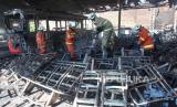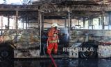 Petugas Dinas Pemadam Kebakaran dan Penyelamatan Kota Surabaya melakukan pembasahaan kursi bus yang terbakar di Kantor Pemasaran dan Pool Damri Cabang Surabaya Jalan Jagir Wonokromo 306, Surabaya, Jawa Timur, Sabtu (22/6/2024). Sebanyak 13 kendaraan pemadam kebakaran dikerahkan untuk memadamkan kebakaran di bagian bengkel tempat itu yang menghanguskan empat mobil, dua sepeda motor dan satu bus listrik. (FOTO : ANTARA FOTO/Didik Suhartono)