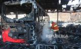 REPUBLIKA.CO.ID, SURABAYA -- Petugas Dinas Pemadam Kebakaran dan Penyelamatan Kota Surabaya melakukan pembasahaan kursi bus yang terbakar di Kantor Pemasaran dan Pool Damri Cabang Surabaya Jalan Jagir Wonokromo 306, Surabaya, Jawa Timur, Sabtu (22/6/2024).