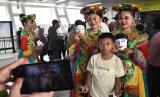 Calon penumpang LRT (Light Rail Transit) berswafoto dengan penari tari topeng Betawi usai tampil di Stasiun Dukuh Atas, Jakarta, Sabtu (22/6/2024). Dalam rangka memperingati ulang tahun Jakarta yang ke-497, LRT Jabodebek (Jakarta Bogor Depok Bekasi) menampilkan tarian topeng betawi dan makanan khas betawi yang dibagikan gratis kepada penumpang. (FOTO : ANTARA FOTO/Fakhri Hermansyah)