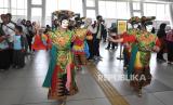 Sejumlah penari tari topeng Betawi tampil di Stasiun Dukuh Atas, Jakarta, Sabtu (22/6/2024). Dalam rangka memperingati ulang tahun Jakarta yang ke-497, LRT Jabodebek (Jakarta Bogor Depok Bekasi) menampilkan tarian topeng betawi dan makanan khas betawi yang dibagikan gratis kepada penumpang. (FOTO : ANTARA FOTO/Fakhri Hermansyah)