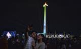 Warga berfoto saat Malam Jaya Raya di kawasan Monas, Jakarta, Sabtu (22/6/2024). Malam Jaya Raya Jakarta menjadi puncak HUT ke-497 Jakarta. Acara ini menampilkan sejumlah hiburan bagi masyarakat seperti pasar malam, penampilan band, karnaval mobil hias, hingga pesta kembang api. HUT kali ini mengusung tema Jakarta Kota Global Berjuta Pesona. Ribuan warga yang berantusias memenuhi kawasan Monas. (FOTO : Republika/Prayogi)