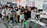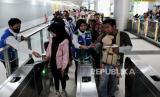 Penumpang mengantre untuk menempelkan kartu uang elektronik sebelum menaiki kereta MRT di Stasiun Bundaran HI, Jakarta, Ahad (23/6/2024). Pemprov DKI Jakarta menerapkan tarif Rp1 untuk layanan transportasi publik seperti MRT, LRT Jakarta dan Transjakarta mulai dari 22-23 Juni 2024 hari ini dalam rangka HUT ke-497 Jakarta. Pemberlakukan tarif Rp1 ini berlaku pada pukul 00.00-23.59 WIB. (FOTO : Republika/Thoudy Badai)