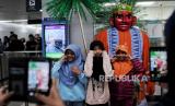 Penumpang berfoto dengan boneka ondel-ondel sebelum menaiki kereta MRT di Stasiun Bundaran HI, Jakarta, Ahad (23/6/2024). Pemprov DKI Jakarta menerapkan tarif Rp1 untuk layanan transportasi publik seperti MRT, LRT Jakarta dan Transjakarta mulai dari 22-23 Juni 2024 hari ini dalam rangka HUT ke-497 Jakarta. Pemberlakukan tarif Rp1 ini berlaku pada pukul 00.00-23.59 WIB. (FOTO : Republika/Thoudy Badai)