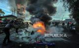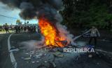 REPUBLIKA.CO.ID, CISARUA -- Polisi berusaha memadamkan api dari ban bekas dan barang yang dibakar Pedagang Kaki Lima (PKL) di Jalan Raya Puncak Bogor, Cisarua, Kabupaten Bogor, Jawa Barat, Senin (24/6/2024). Sejumlah PKL melakukan penutupan jalan karena tidak terima lapak dagangan mereka dibongkar oleh petugas gabungan Satpol PP, Polri dan TNI, sehingga menimbulkan kemacetan lalu lintas di wilayah tersebut.