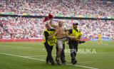 Petugas mengamankan seorang suporter yang masuk ke dalam lapangan saat pertandingan Grup C antara Slovenia dan Serbia pada turnamen sepak bola Euro 2024 di Munich, Jerman, Kamis (20/6/2024). (FOTO : AP Photo/Matthias Schrader)