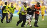Petugas mengamankan seorang suporter yang masuk ke dalam lapangan saat pertandingan Grup E antara Rumania dan Ukraina pada turnamen sepak bola Euro 2024 di Munich, Jerman, Senin (17/6/2024). (FOTO : AP Photo/Matthias Schrader)