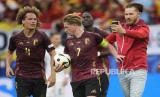 Tak hanya Ronaldo, gelandang Belgia Kevin De Bruyne dihampiri suporter untuk berswafoto saat pertandingan penyisihan Grup E melawan Slovakia. Bintang Manchester City tersebut tampak tidak menyadari Ketika dihampiri penggemarnya.