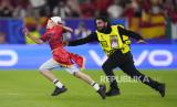 Petugas mengamankan seorang suporter yang masuk ke dalam lapangan saat pertandingan Grup B antara Albania dan Spanyol pada turnamen sepak bola Euro 2024 di Duesseldorf, Jerman, Senin (24/6/2024). (FOTO : AP Photo/Manu Fernandez)