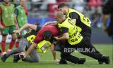 Petugas mengamankan seorang suporter yang masuk ke dalam lapangan saat pertandingan Grup F antara Turki dan Portugal pada turnamen sepak bola Euro 2024 di Dortmund, Jerman, Sabtu (22/6/2024). (FOTO : AP Photo/Themba Hadebe)