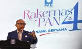 REPUBLIKA.CO.ID, JAKARTA -- Ketua Umum PAN (Partai Amanat Nasional) Zulkifli Hasan memberi sambutan saat Rakernas (Rapat Kerja Nasional) ke 4 di Jakarta, Sabtu (29/6/2024).