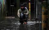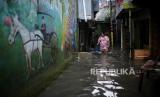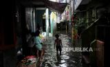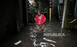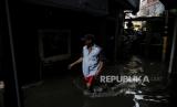 Warga beraktivitas saat pemukimannya terendam banjir di kawasan Kampung Pulo, Kampung Melayu, Jakarta Timur, Selasa (2/7/2024). Banjir tersebut merendam pemukiman warga usai diterjang hujan pada Senin (1/7) malam yang menyebabkan kenaikan debit air di sungai Ciliwung. Banjir setinggi sekitar 60 centimeter tersebut melanda 5 RT di wilayah Jakarta Timur diantaranya 4 RT di Kelurahan Kampung Melayu, 1 RT di Kelurahan Cawang. Meski demikian, kondisi banjir di wilayah Kampung Pulo sudah berangsur surut. (FOTO : Republika/Thoudy Badai)