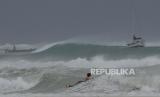 Seorang peselancar menantang ombak saat terjadinya Badai Beryl di Teluk Carlisle, Bridgetown, Barbados, Senin (1/7/2024). Badai Beryl yang dikategorikan berbahaya menerjang wilayah Barbados. Badai berupa hujan lebat, banjir, dan angin kencang itu menghancurkan kota. (FOTO : AP Photo/Ricardo Mazalan)