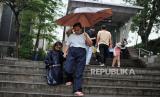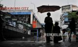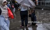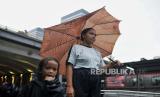 Nita (33) bersama anaknya bergegas usai menjajakan jasa ojek payung di area Stasiun Sudirman, Jakarta, Kamis (4/7/2024). Jasa ojek tersebut tidak dipatok harga atau dibayar seikhlasnya. Sekali ngojek, biasanya Nita mendapatkan upah sebesar Rp5.000 hingga Rp10.000 dari pengguna jasanya. (FOTO : Republika/Thoudy Badai)