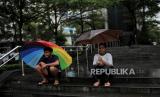 Nita (33) berisitirahat disela-sela menjajakan jasa ojek payung di area Stasiun Sudirman, Jakarta, Kamis (4/7/2024). Jasa ojek tersebut tidak dipatok harga atau dibayar seikhlasnya. Sekali ngojek, biasanya Nita mendapatkan upah sebesar Rp5.000 hingga Rp10.000 dari pengguna jasanya. (FOTO : Republika/Thoudy Badai)