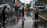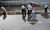 Nita (33) bersama temannya saat menjajakan jasa ojek payung di area Stasiun Sudirman, Jakarta, Kamis (4/7/2024). Jasa ojek tersebut tidak dipatok harga atau dibayar seikhlasnya. Sekali ngojek, biasanya Nita mendapatkan upah sebesar Rp5.000 hingga Rp10.000 dari pengguna jasanya. (FOTO : Republika/Thoudy Badai)