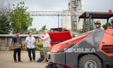 Direktur PT Kobexindo Equipment Suryanto (kiri), Kepala Divisi PT Kobexindo Equipment Yoga Pratomo (kanan) melihat mesin sapu produksi PT Kobexindo Equipment di Tuban, Jawa Timur, Kamis (4/7/2024). PT Kobexindo Equipment (KOBE) memasok 4-unit mesin sapu, Powerboss Armadillo 10X ke salah satu pabrik semen terkemuka di Indonesia untuk pengelolaan lingkungan yang berkelanjutan. Sebelumnya, pada 2019 lalu KOBE juga telah memasok sebanyak 3-unit Powerboss Armadillo 9X ke pabrik semen tersebut. (FOTO : Dok Republika)