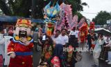 REPUBLIKA.CO.ID, BANDUNG -- Iring-iringan seni budaya memeriahkan karnaval Asia Afrika Festival (AAF) 2024 di Jalan Asia Afrika, Kota Bandung, Jawa Barat, Sabtu (6/7/2024).