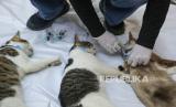 Petugas menyuntikkan obat kepada kucing yang telah disterilisasi di Gelanggang Remaja Pulogadung, Jakarta, Ahad (7/7/2024). DKPKP Jakarta bersama Animal Defender Indonesia dan Radhiyan Pet Care menggelar sterilisasi kucing liar dan berpemilik tidak mampu secara gratis dengan kuota 500 kucing yang bertujuan untuk mengendalikan populasi kucing. (FOTO : ANTARA FOTO/Asprilla Dwi Adha)