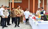REPUBLIKA.CO.ID, JAKARTA -- Presiden Joko Widodo meninjau bantuan yang akan diberangkatkan di Lanud Halim Perdanakusuma, Jakarta, Senin (8/7/2024).