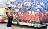 Presiden Joko Widodo meninjau bantuan yang akan diberangkatkan di Lanud Halim Perdanakusuma, Jakarta, Senin (8/7/2024). Pemerintah Indonesia memberangkatkan bantuan kemanusiaan ke Papua Nugini yang dilanda peristiwa tanah longsor dan Afghanistan yang dilanda gempa bumi. (FOTO : Biropers Istana)