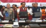 REPUBLIKA.CO.ID, JAKARTA -- Petugas menghadirkan tersangka saat konferensi pers pengungkapan kasus tindak pidana perjudian online jaringan internasional di Gedung Bareskrim, Mabes Polri, Jakarta, Senin (8/7/2024).