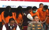 Petugas menghadirkan tersangka saat konferensi pers pengungkapan kasus tindak pidana perjudian online jaringan internasional di Gedung Bareskrim, Mabes Polri, Jakarta, Senin (8/7/2024). Dittipidum Bareskrim Polri mengungkap tindak pidana perjudian online dan pornografi online sindikat internasional jaringan Taiwan dengan menangkap tujuh orang tersangka dan menyita barang bukti berupa HP, laptop serta alat live streaming. (FOTO : ANTARA FOTO/Hafidz Mubarak A)