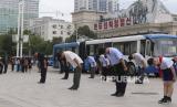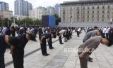 Sejumlah warga menundukan kepala dan mengheningkan cipta selamat tiga menit di depan patung Kim II Sung dan Kim Jong II untuk meenghormati sekaligus memperingati kematiannya.